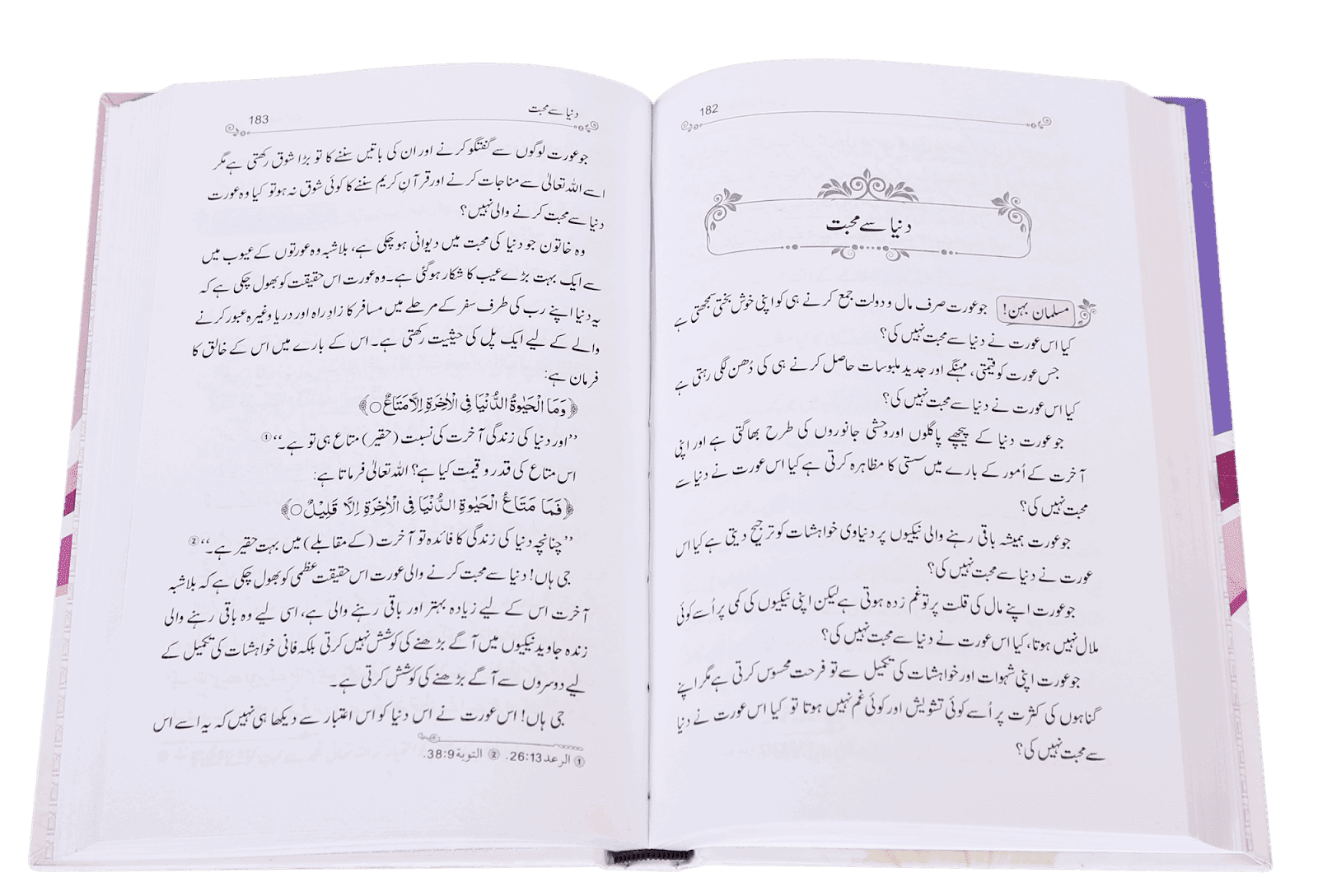 خانگی اور معاشرتی زندگی کا حسن بڑی حد تک عورت کے کردار پر موقوف ہے۔ عورت شرک سے بیزار اور وحدہ لاشریک کی پرستار ہوگی تو اس کی گود میں پلنے والے بچے بھی اللہ کے شیدائی، رسول ﷺ کے فدائی اور اسلام کے سپاہی بنیں گے۔ اس لحاظ سے اس بات کا بخوبی اندازہ کیا جا سکتا ہے کہ عورت کی دینی تعلیم و تربیت کس قدر زبردست اہمیت کی حامل ہے۔ حقائق سے آگہی فوری اور ابدی خوشی کے حسول کا لازوال سر چشمہ ہے۔ یہ کتاب اُن اہم دینی </p>حقائق و معارف کا گلدستہ ہے جنھیں سیکھے بغیر کوئی خاتون اچھی سیرت سازی کے تقاضے پورے نہیں کر سکتی۔ یہ کتاب توہم پرستی سے بچنے اور عقل و بصیرت سے کام لینے کا سبق دیتی ہے۔ اس میں بتایا گیا ہے کہ عورت کی شخصیت میں سچائی کی روح بولے گی تو اس کے سارے خاندان میں صداقت کا اُجالا پھیل جائے گا۔ یہ کتاب شوہر کے حقوق ومفادات کی نگہبانی اور اولاد کی تربیت کے گرُ سیکھاتی ہے۔اسے پڑھیے </p>اور اپنے خاندان کی محترم خواتین کی خدمت میں بطور تحفہ پیش کیجیے۔ ان شا ء اللہ ! اس کتاب کی تعلیمات سے آپ کا گھرانا گہواہ رحمت بن جائیگا۔