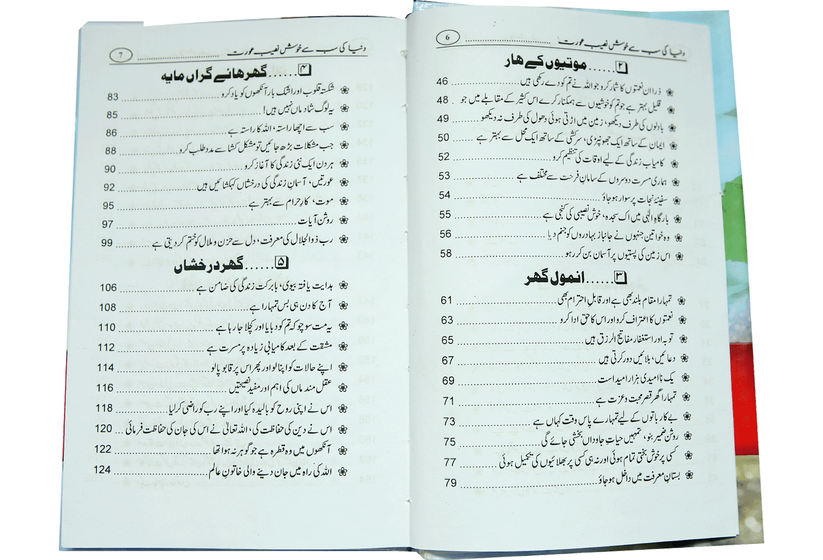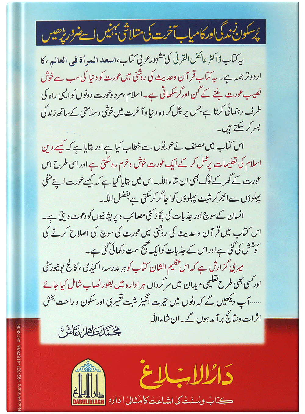 زیرِ نظر کتاب قرآن وحدیث کی روشنی میں عورت کو دنیا کی سب سے خوش نصیب عورت بننے کے گن اور گر سکھاتی ہے،اس کتاب میں مصنف نے عورتوں سے خطاب کیا ہےاور بتایا کہ کیسے دینِ اسلام کی تعلیمات پر عمل کرکے ایک عورت خوش وکرم رہ سکتی ہےاور اسی طرح اس عورت کے گھر والے بھی ان شاءاللہ۔مزید برآں ہی کہ عورت اپنے منفی پہلووَں سے ابھر کر مثبت پہلووَں کو اجاگر کرسکتی ہے۔